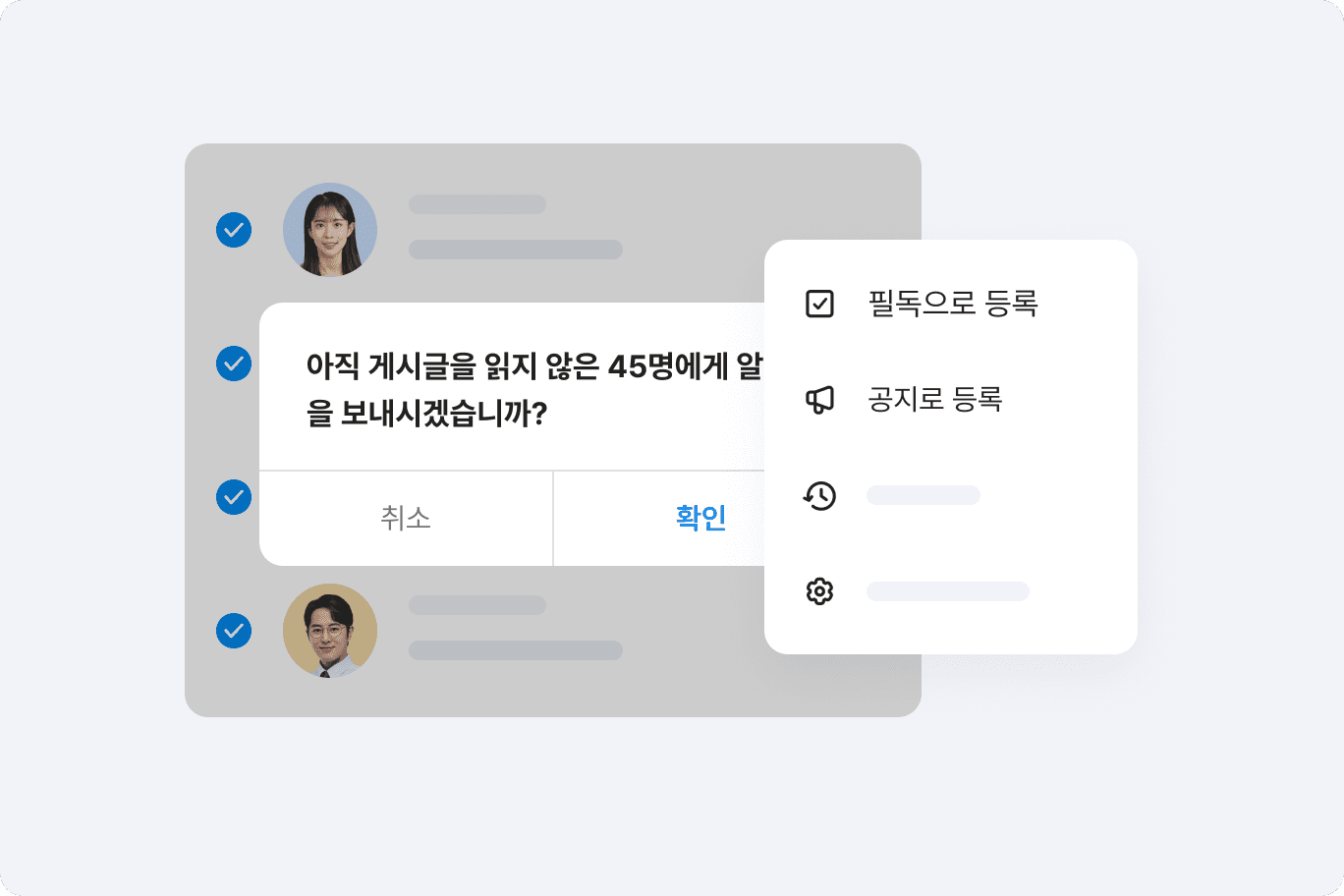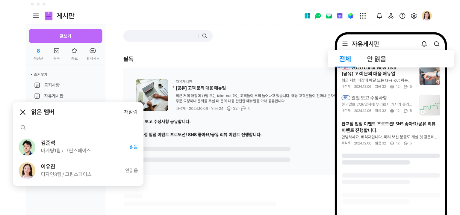 신규 게시글 등록 시 전 직원에게 실시간 알림이 발송되어 전 직원에게 공유가 가능하며, 알림 이후에도 읽지 않은 직원이 있다면 댓글에 @로 언급하거나 알림을 다시 보내 중요한 내용을 놓치지 않도록 안내할 수 있습니다.