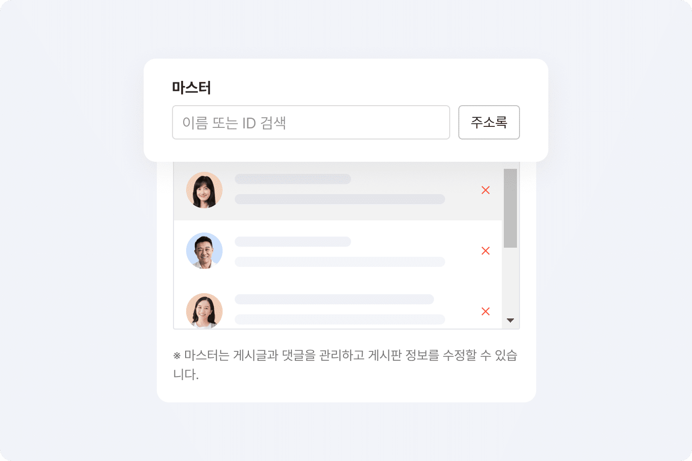 등록하고자 하는 게시글의 성격에 맞게 세부 게시판을 만들어 운영하거나, 게시판별 팀원의 접근 및 게시글 편집 권한 설정 또한 지정할 수 있어 권한을 가진 팀원만 참여할 수 있는 게시판 운영 또한 가능합니다.