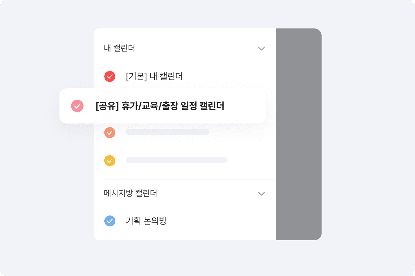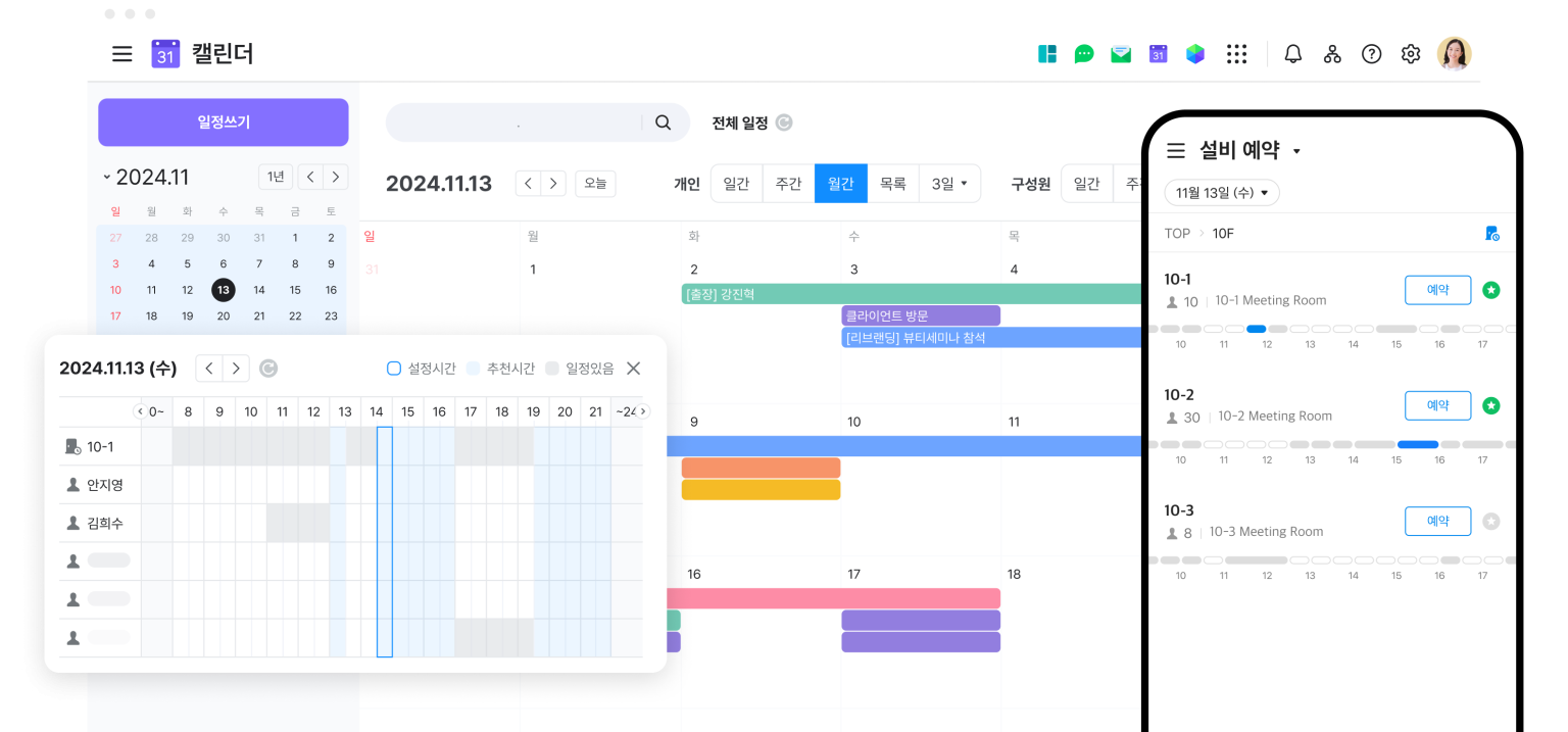 자주 연락하는 팀원의 일정을 확인하기 위해 일일이 검색하지 않아도 됩니다. 팀원을 캘린더 내 즐겨찾기 추가하면 해당 팀원의 일/주/월간 일정을 한눈에 파악할 수 있습니다.