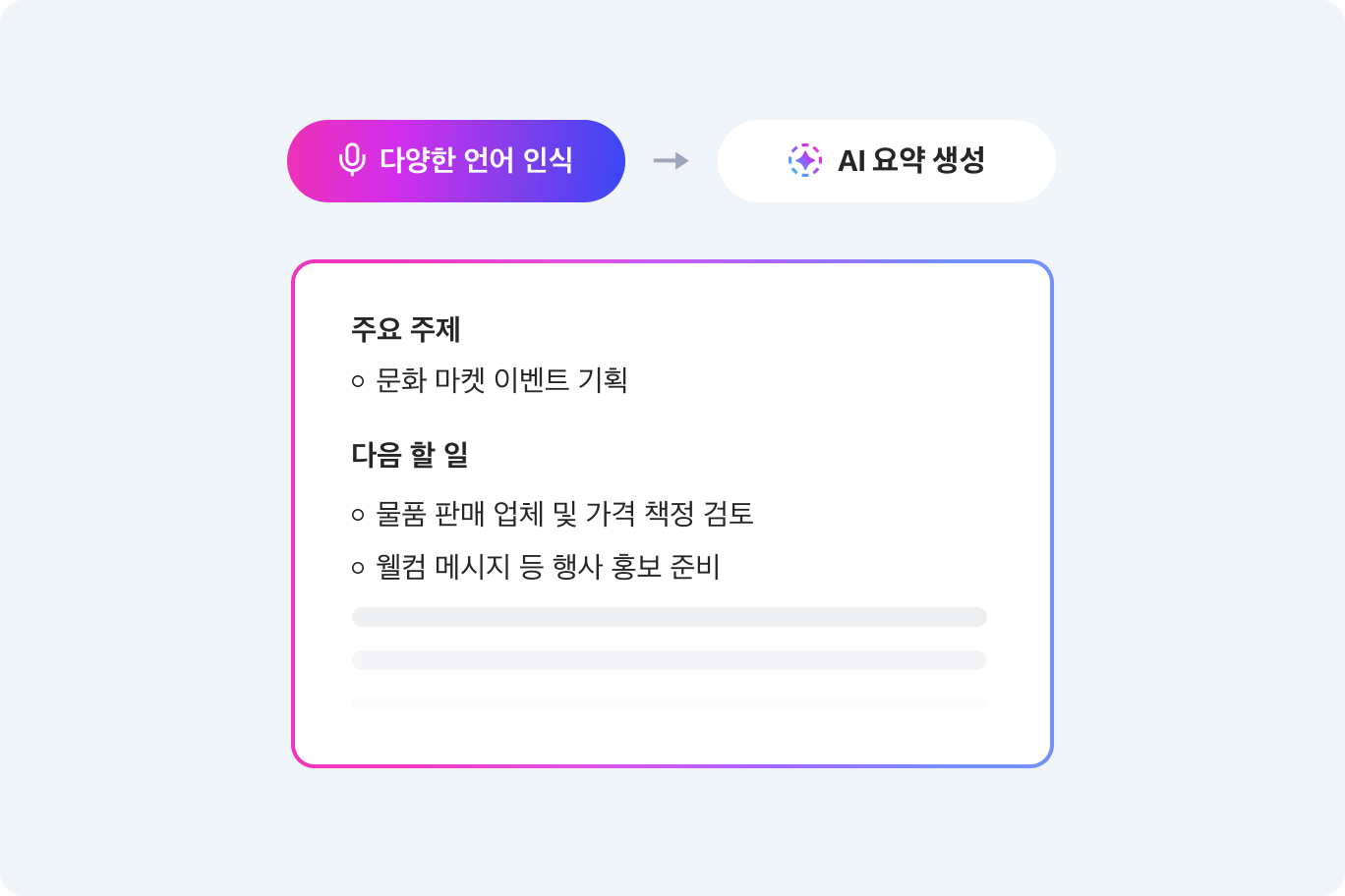 영어, 일본어, 중국어 등 다양한 언어를 정확하게 인식할 수 있고, 회의 내용을 바탕으로 주요 내용을 요약하고 다음 할 일을 추천해 줍니다. 기업별 고유명사/전문용어를 어휘사전에 등록해 기업에 특화된 AI 모델 사용이 가능합니다.