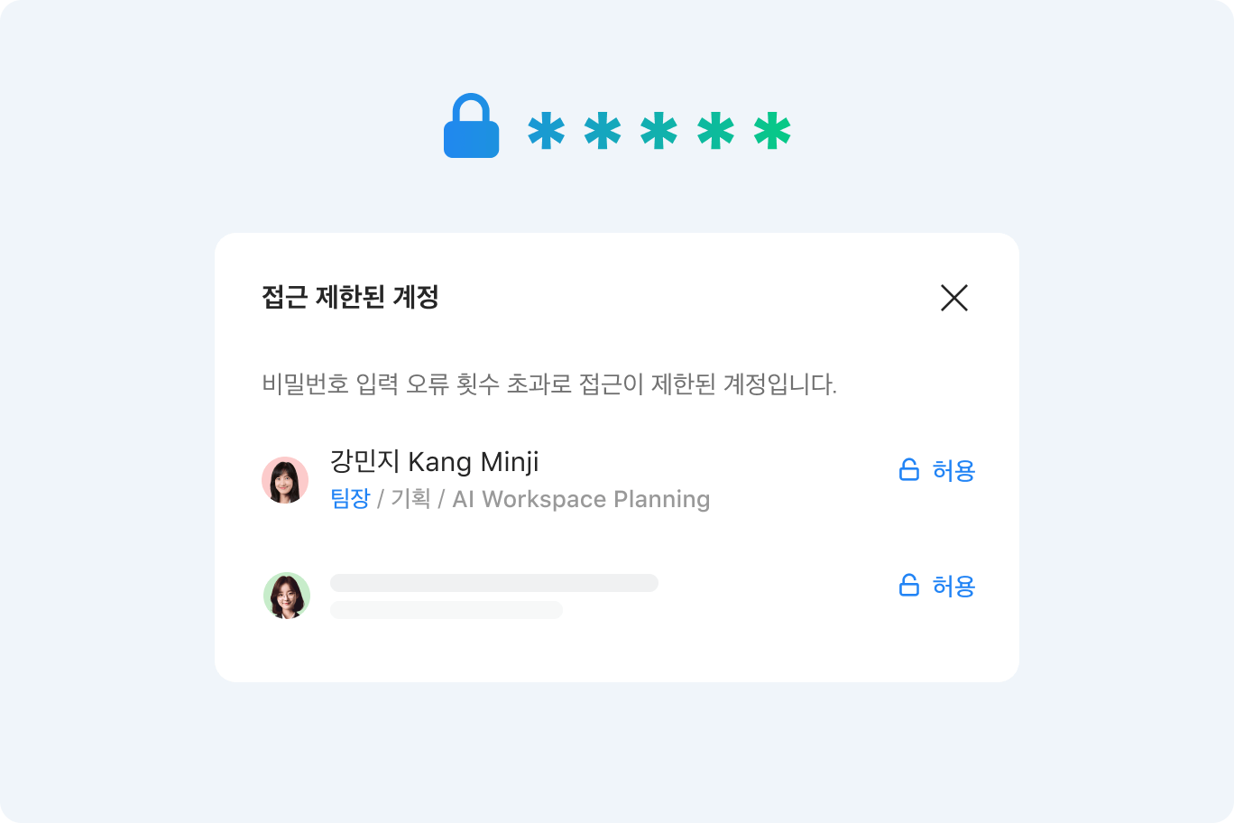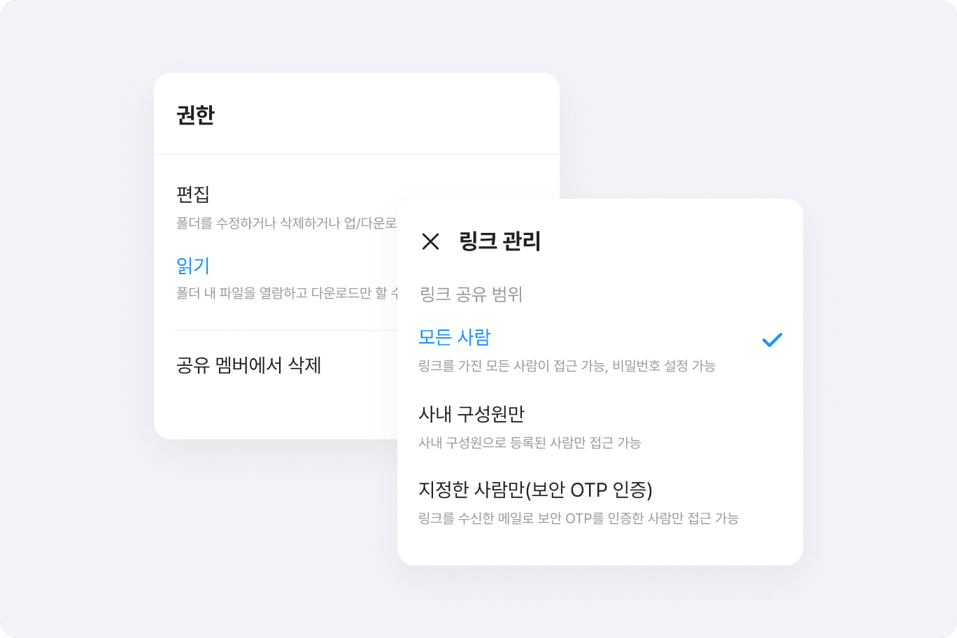 파일 또는 폴더 별 상세 권한 설정으로 회사 데이터를 더욱 안전하게 보호 할 수 있어요. 보안에 주의가 필요한 자료는 인증된 사람만 접근 가능하도록 설정하거나 외부 공유가 필요한 자료는 암호 또는 만료일을 설정한 공유 링크를 통해 안전하게 공유할 수 있습니다.