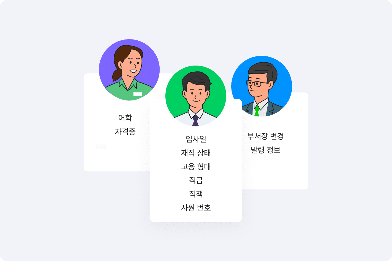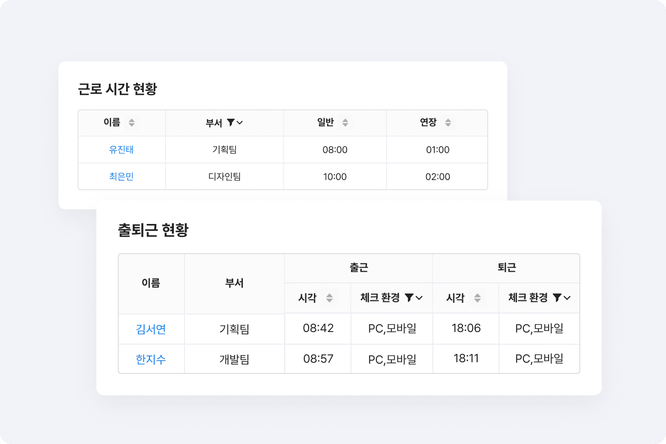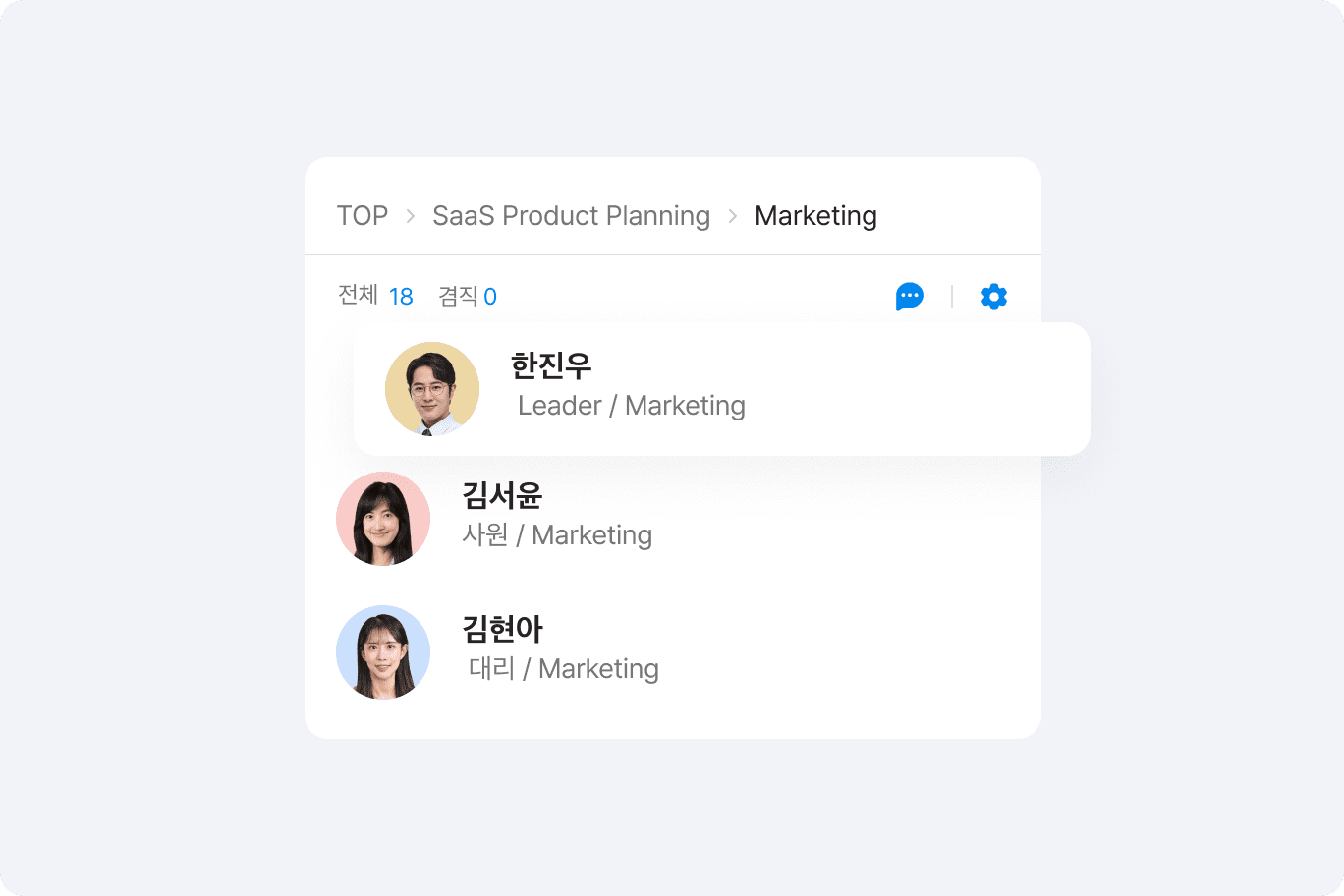 회사 조직도와 동일하게 조직/부서 단위 및 계층 구조를 설정하고 팀원을 주소록에 등록할 수 있어 조직별 소속된 구성원을 한눈에 파악할 수 있습니다. 구성원의 겸직 여부 또한 확인할 수 있습니다.