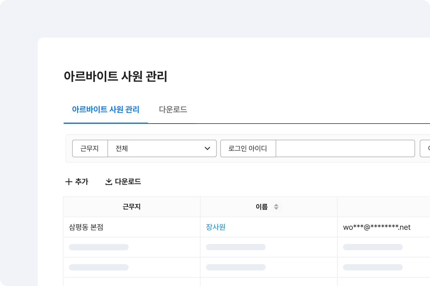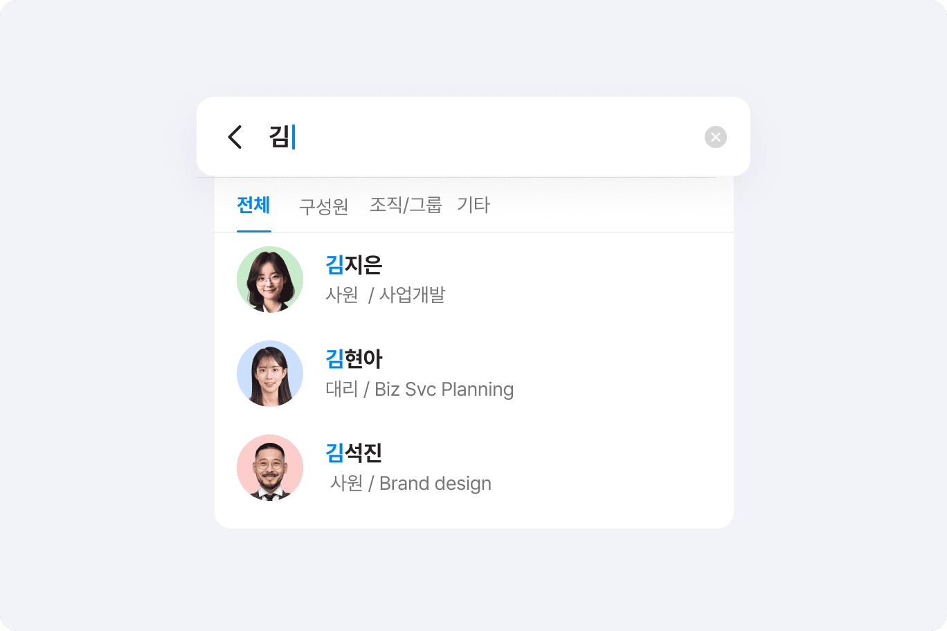 부서명이나 이름, 직책, 담당업무 등 일부 정보만 알아도 원하는 팀원 또는 거래처 정보를 쉽게 검색해서 찾을 수 있습니다.