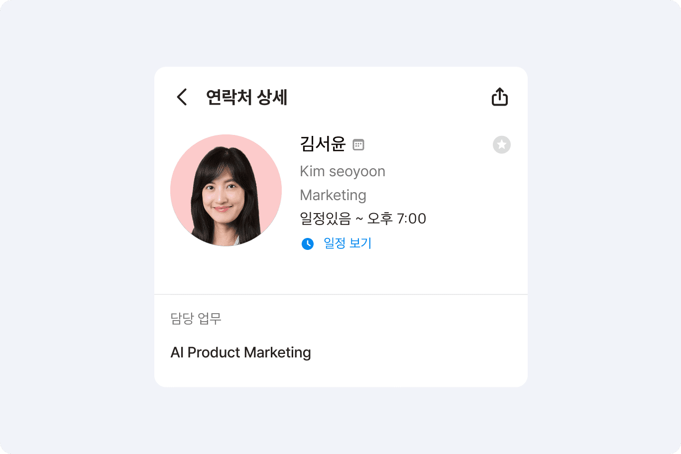 구성원의 연락처 상세 프로필에서 메시지나 음성 통화, 메일, 약속 초대를 바로 보낼 수 있습니다. 구성원별 담당업무 설정이 가능하여, 특정 업무에 대한 담당자 및 연락처를 즉시 확인할 수 있습니다. 바쁨, 자리 비움, 퇴근, 부재중 등 현재 업무 상태를 살펴보고 업무 진행에 참고해 보세요.