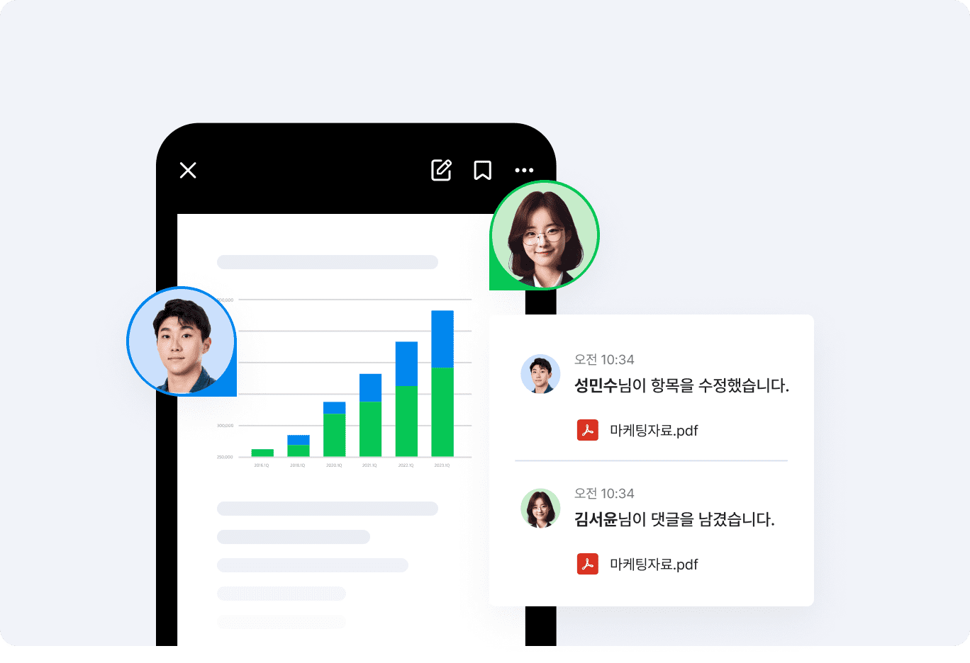 파워포인트, 워드, 엑셀 등 다양한 포맷의 문서에 동시에 접속, 실시간으로 함께 문서를 편집하며 더 강력해지는 팀워크를 느껴보세요. 변경 내용이 실시간으로 업데이트되어 가장 최신 정보의 문서로 협업이 가능해집니다.
