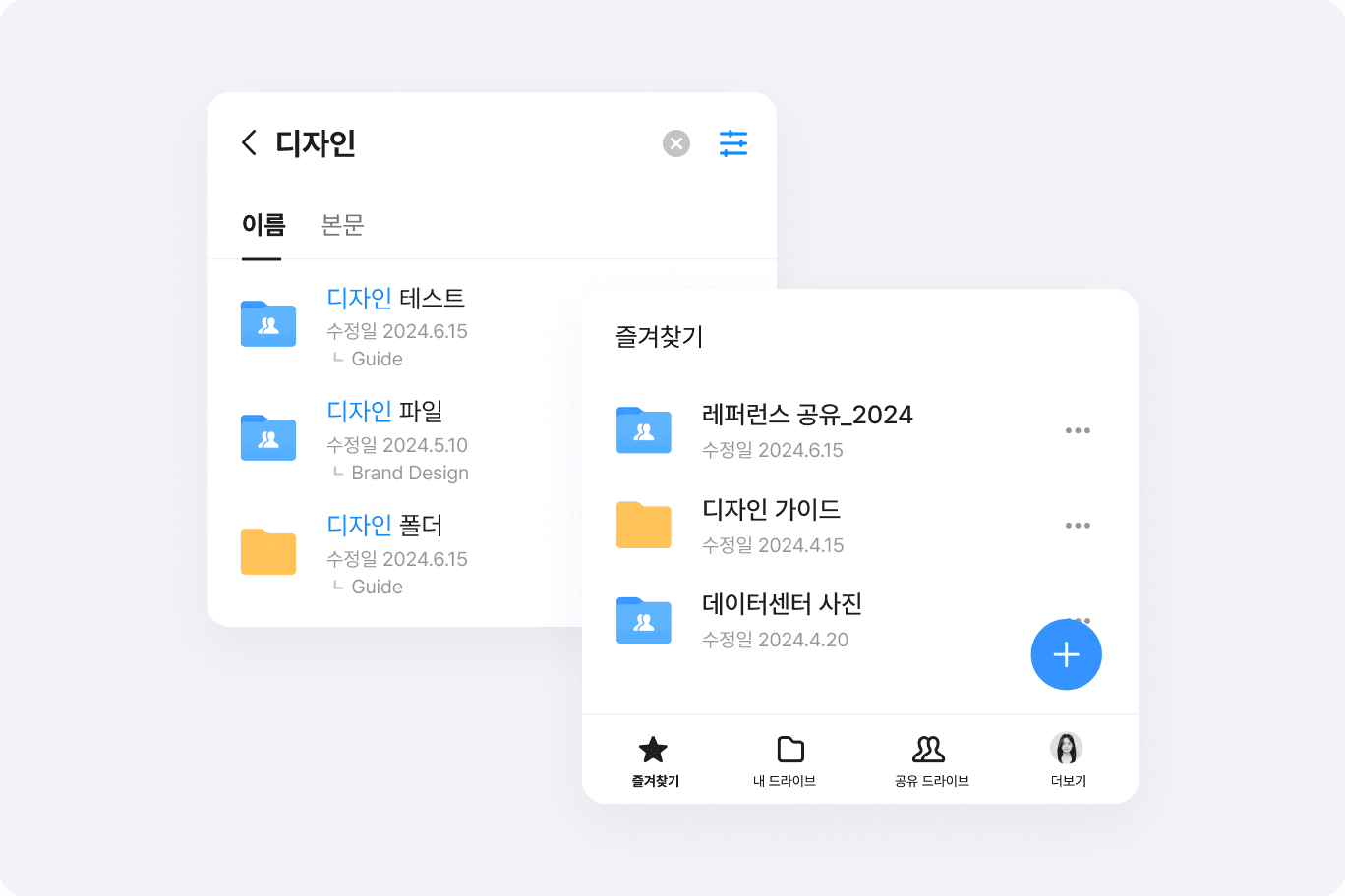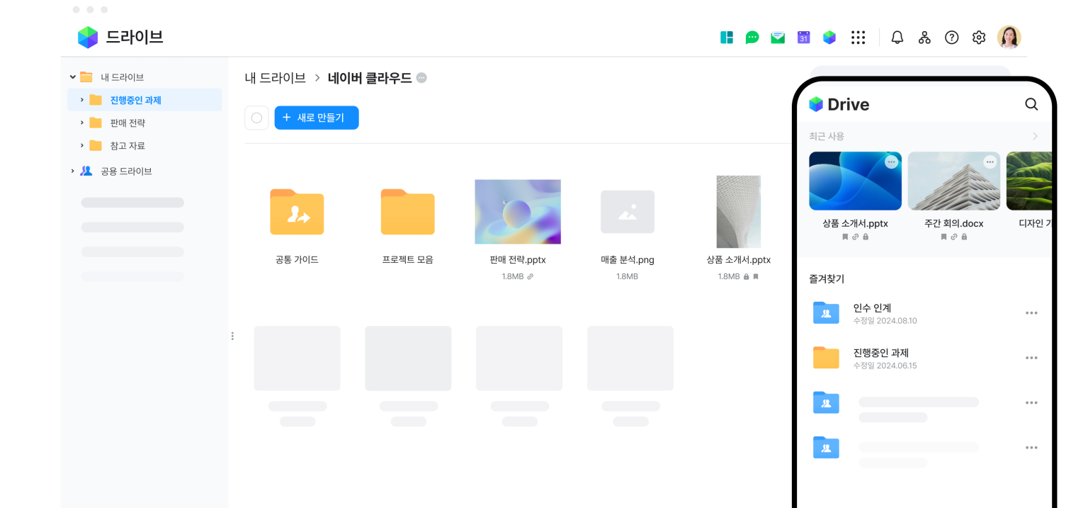 언제 어디서나 PC, 모바일, 웹 모든 디바이스에서 필요한 자료에 접속해 끊김 없이 업무를 이어갈 수 있어요. 또한, 상세 검색과 즐겨찾기 설정을 통해 원하는 파일과 폴더를 쉽고 빠르게 찾을 수 있습니다.
