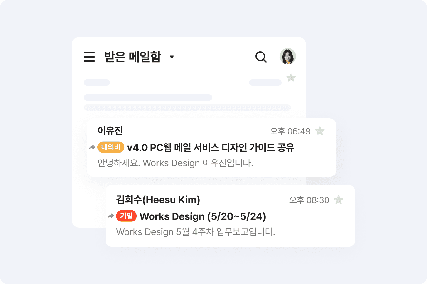읽지 않은 메시지가 10개 이상인 경우 WORKS AI가 메시지 내용을 자동으로 요약해 주어 모든 메시지 내용을 읽지 않고도 핵심 내용을 빠르게 파악할 수 있습니다.