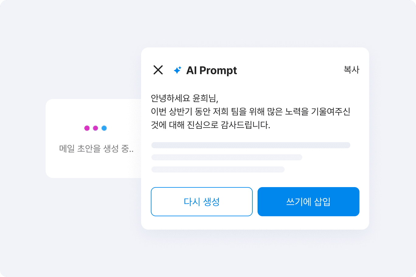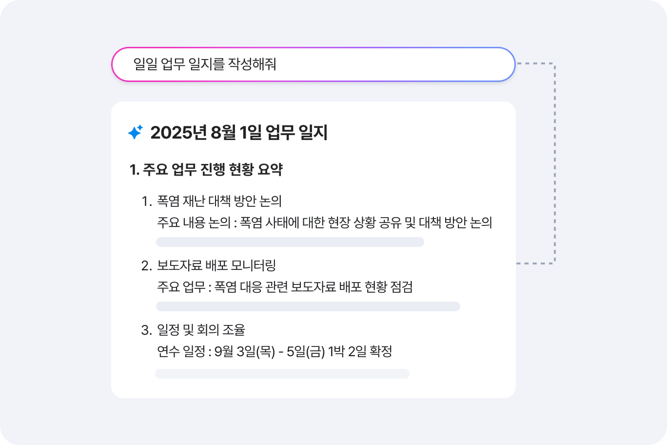 보고서 초안 작성부터 일일 업무 일지 작성까지, AI가 후속 업무를 함께 하는 동안 당신은 지금의 일에 온전히 몰입해 보세요.
