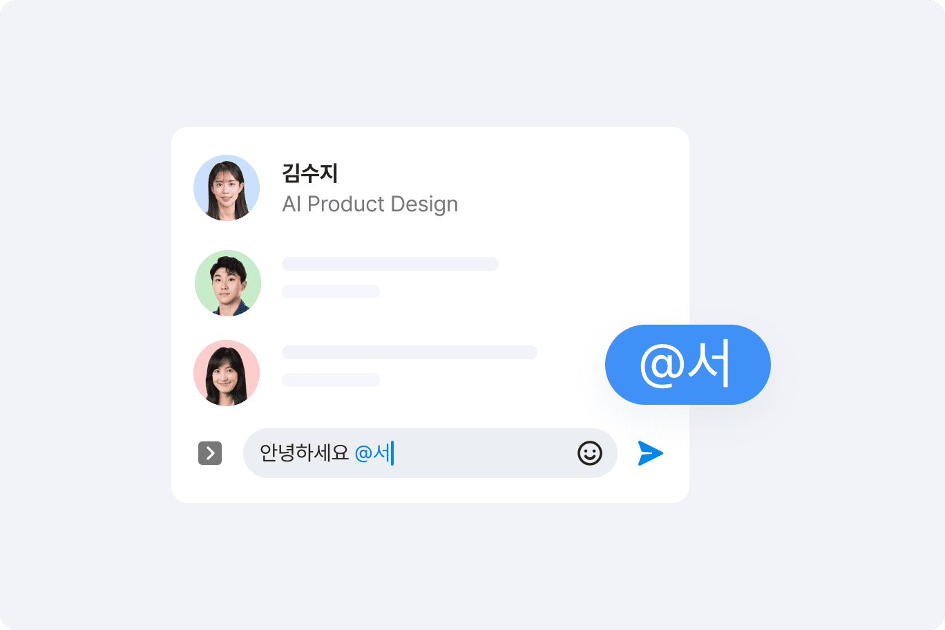 하루에도 수백 건씩 주고받는 메시지 속 특정 멤버에게 특히 강조하여 보내고 싶은 내용이 있다면 @멘션하여 메시지를 보내보세요. 메시지방 단위로 멘션 알림 설정이 가능하여 내가 멘션된 메시지만 알림을 받을 수 있습니다.