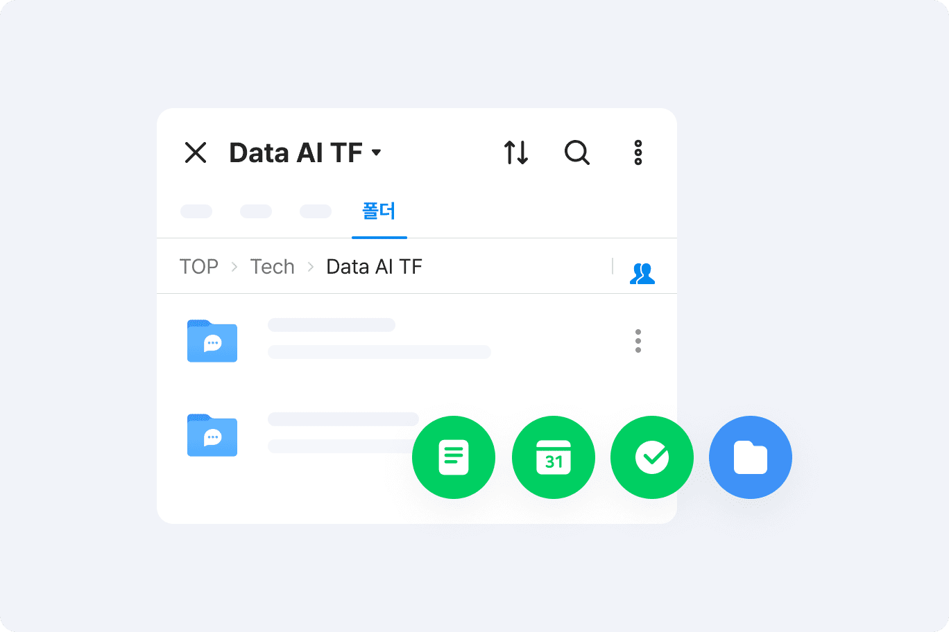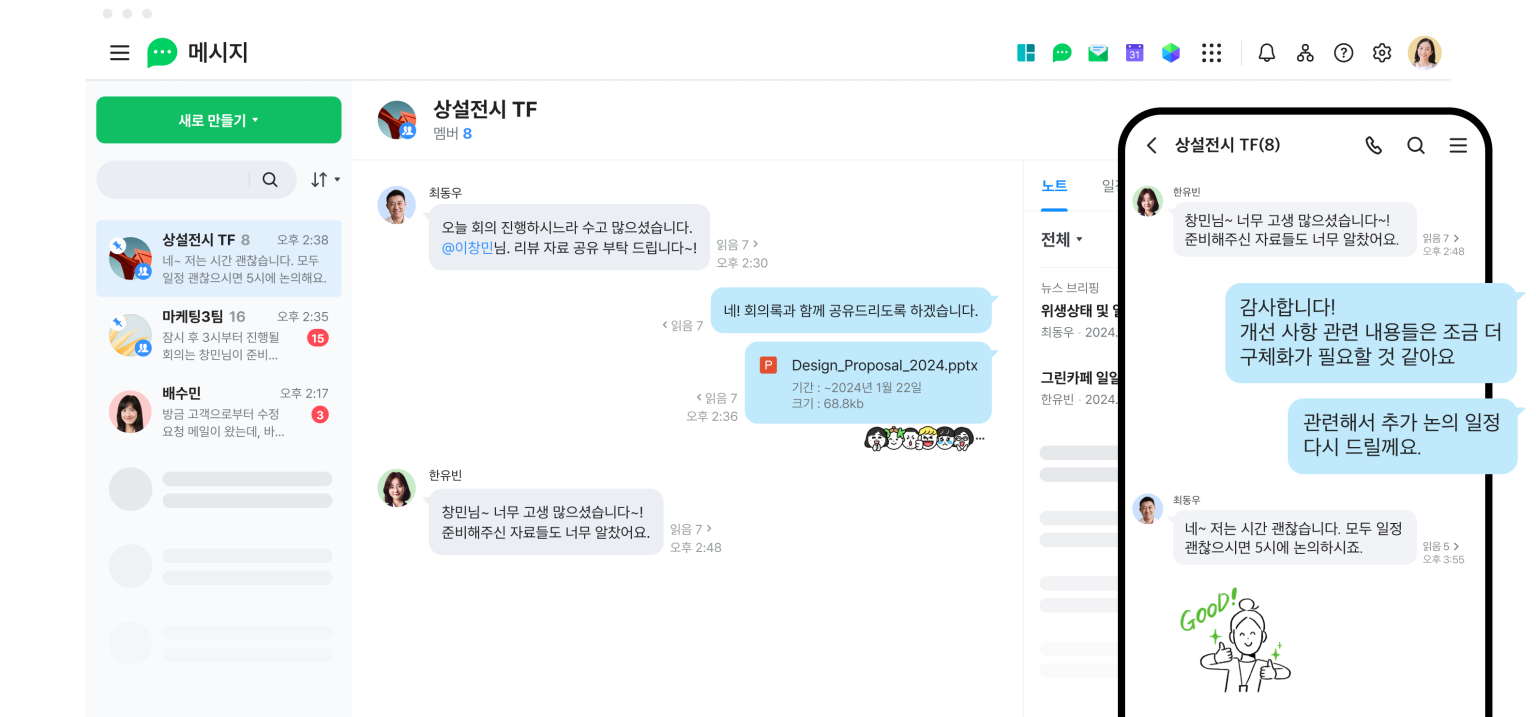 협업에 최적화된 노트/일정/할 일/폴더 기능이 메시지방 내 기본 탑재되어 제공됩니다.메시지방에 참석한 멤버 모두가 편집 및 관리할 수 있어 데이터의 분산이나 유실 걱정 없이 자유롭게 정보를 공유할 수 있습니다.