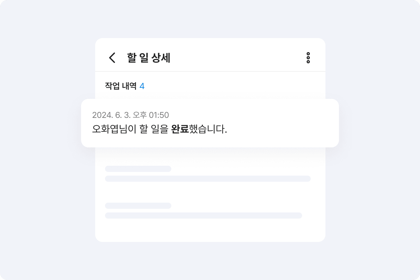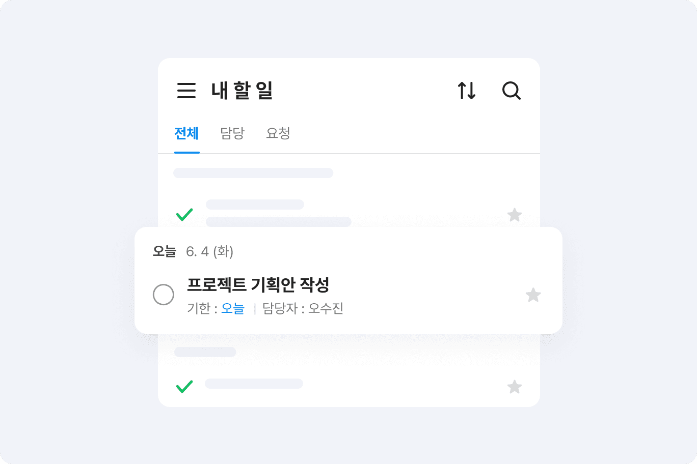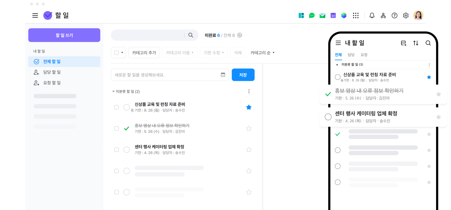 담당자에게 요청한 할 일이 모두 작업 완료되었는지 궁금하다면, 담당자에게 직접 물어보지 않고도 할 일 작업 목록에서 쉽게 찾아볼 수 있습니다. 중요도나 완료된 할 일 순으로 목록을 정렬하여 작업별 진행 현황을 수시로 체크할 수 있어 업무 연속성을 유지할 수 있습니다.