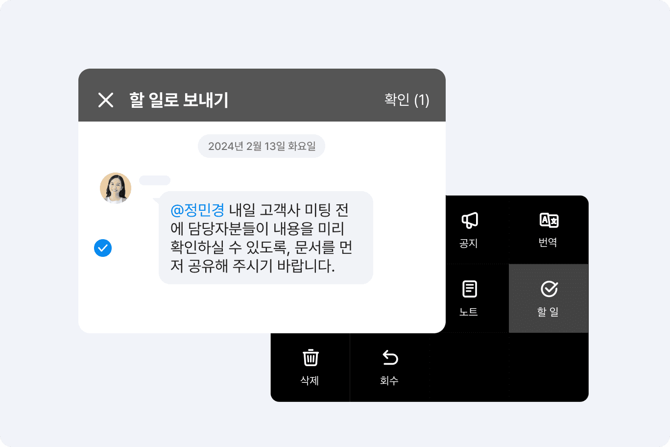 업무와 관련한 내용이 담긴 메시지를 선택해 할 일에 등록할 수 있습니다. 업무에 대한 내용이 기억이 안 날 때 메시지방을 다시 찾아볼 필요 없이 할 일에서 바로 메시지 내용을 확인할 수 있어 업무를 꼼꼼하게 챙길 수 있습니다.