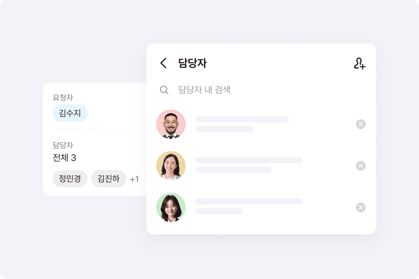 업무 기한과 담당자를 지정해서 할 일을 요청할 수 있습니다. 요청한 할 일은 담당자가 놓치지 않게 메시지 알림으로 안내되고 담당자의 할 일 목록에도 자동으로 등록됩니다. 혼자 해결하기 어려운 할 일에는 여러 명의 담당자를 지정할 수 있습니다.