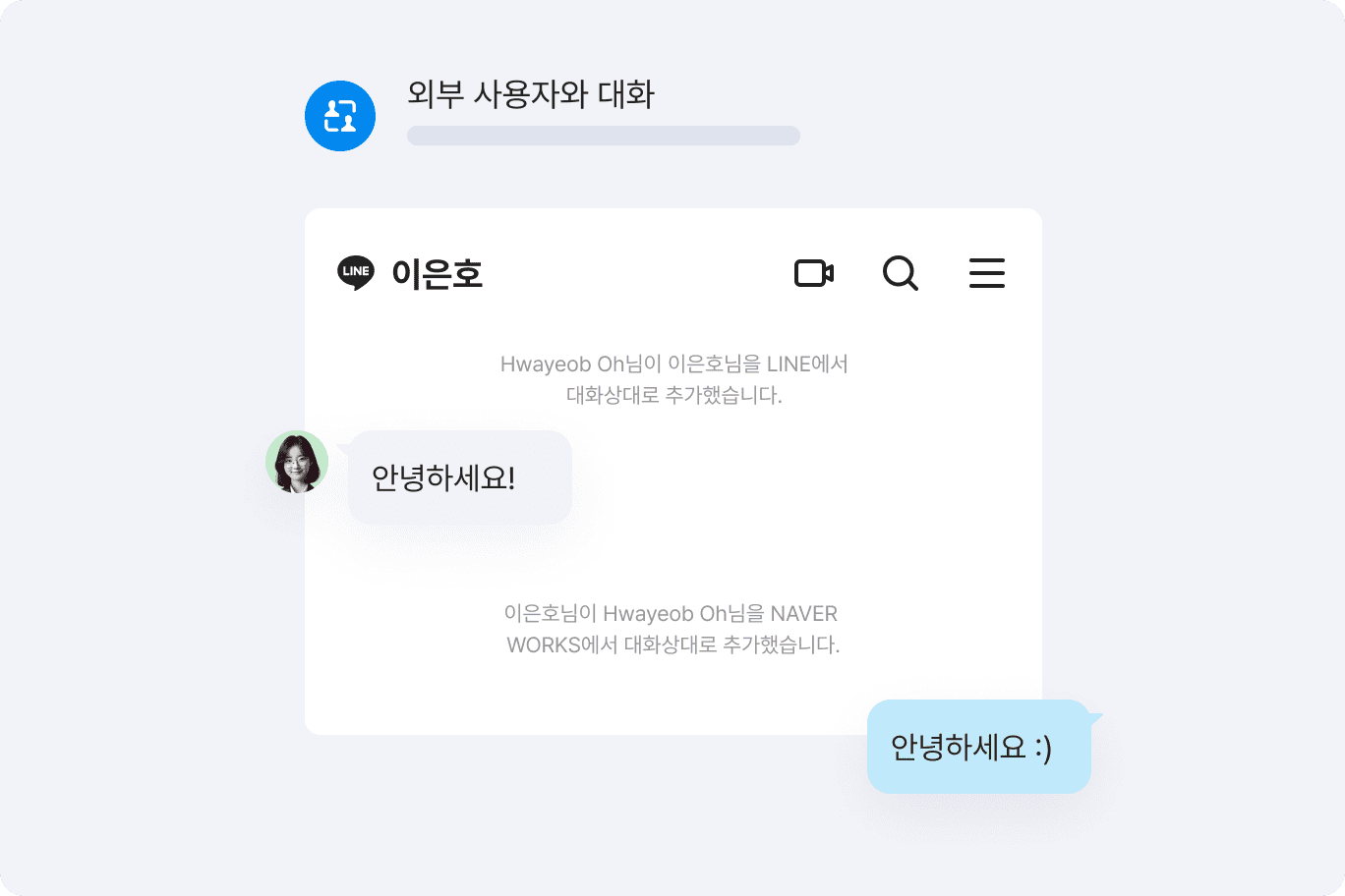 LINE을 사용하는 고객 또는 거래처 직원뿐만 아니라 다른 회사의 네이버웍스 계정과도 연동되어 이제 더 이상 업무를 위해 여러 메신저를 사용하지 않아도 됩니다.