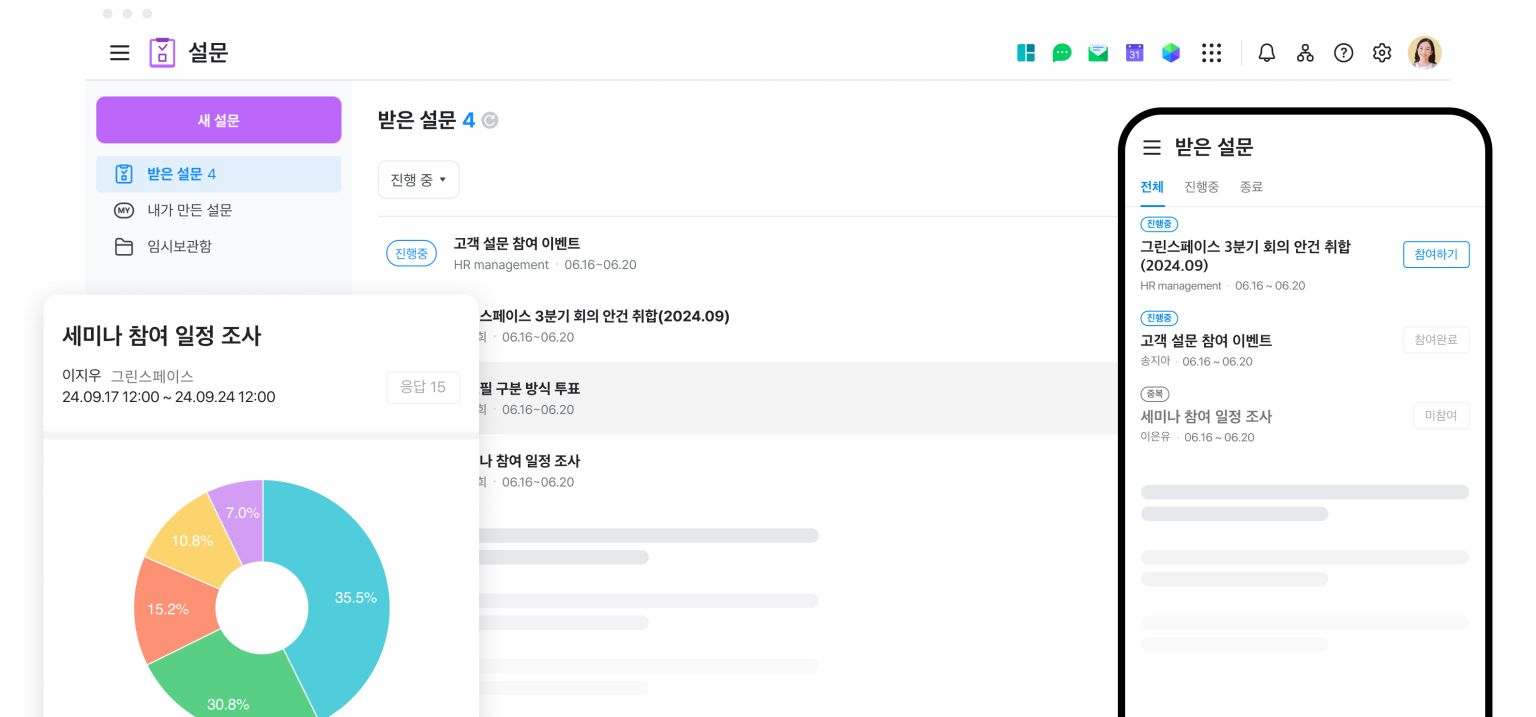 설문 참여자를 사내 팀/조직 단위로 특정하여 설문을 요청할 수 있고, LINE 또는 다른 회사의 네이버웍스 사용자에도 설문을 보낼 수 있어 고객 또는 거래처에 설문 요청이 가능합니다.