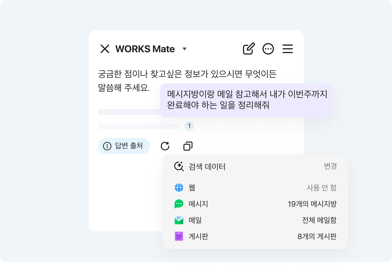 웹 정보는 물론, 게시판·메시지·드라이브에 쌓인 사내 데이터를 함께 탐색하여 업무의 맥락을 이해한 정확하고 신뢰도 높은 답변을 제공합니다.